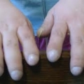 Симптомы: лихорадка, кашель, гнойная мокрота, боль в груди, кровохарканье, свистящее дыхание, хрипы в легких, пальцы в виде барабанных палочек, ногти в виде часовых стекол, а также возможно проявление таких симптомов как одышка, утомляемость, синий цвет кожи (цианоз)