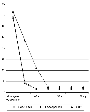 После отмены препарата у большинства больных время кровотечения и другие функции тромбоцитов возвращаются к нормальным значениям в течение одной недели. Подавление агрегации тромбоцитов наступает в течение двух дней с начала применения тиклопидина дважды в сутки.