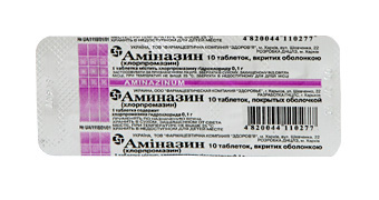 активного вещества: аминазина (хлорпромазина)25 мг, 50 мг или 100 мг,