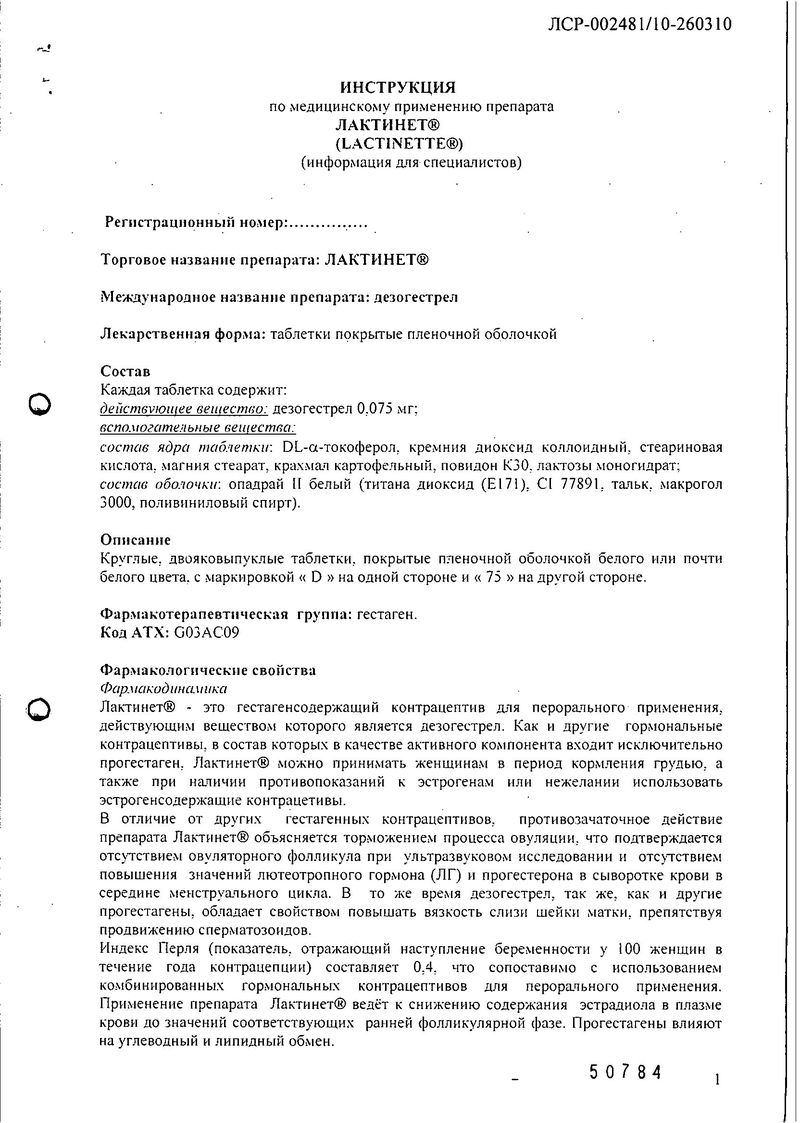 (LACTINETTE®)Регистрационный номер: ЛСР-002481/10-260310